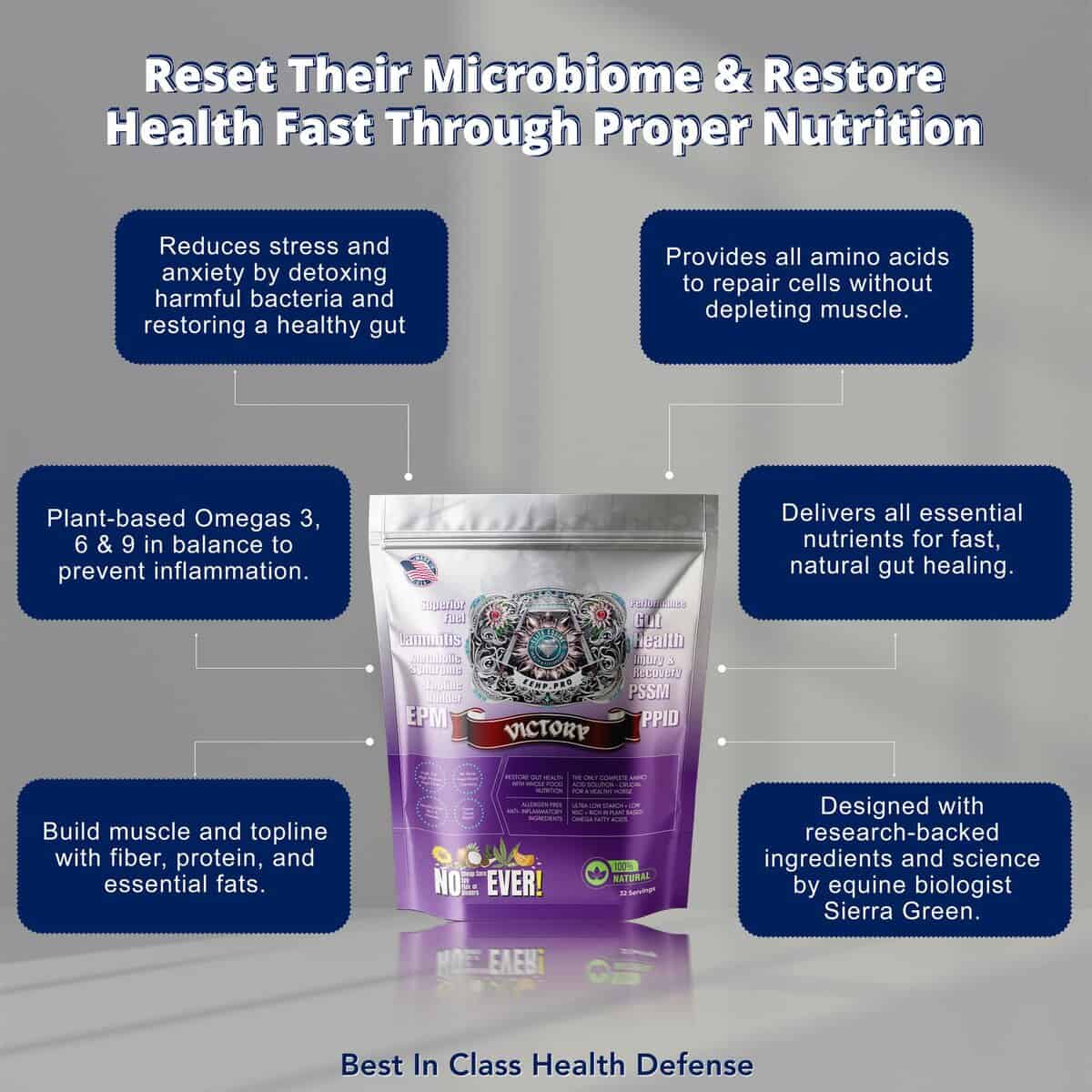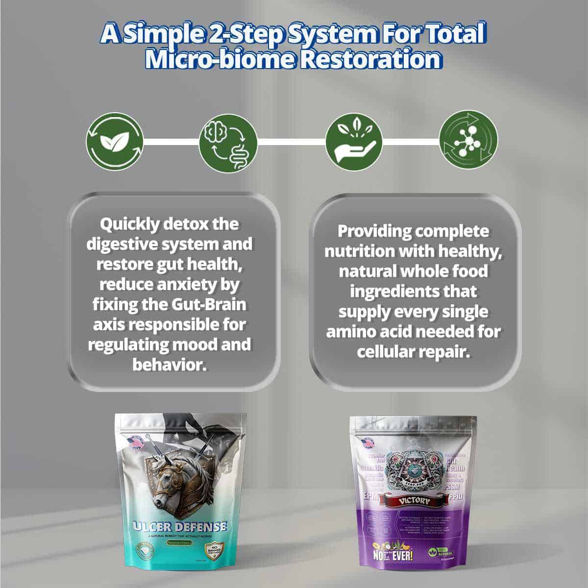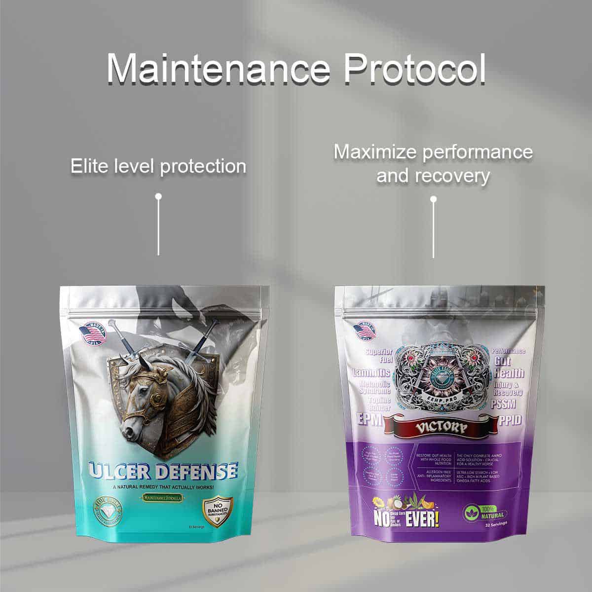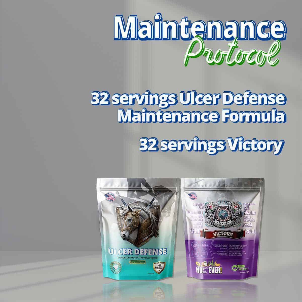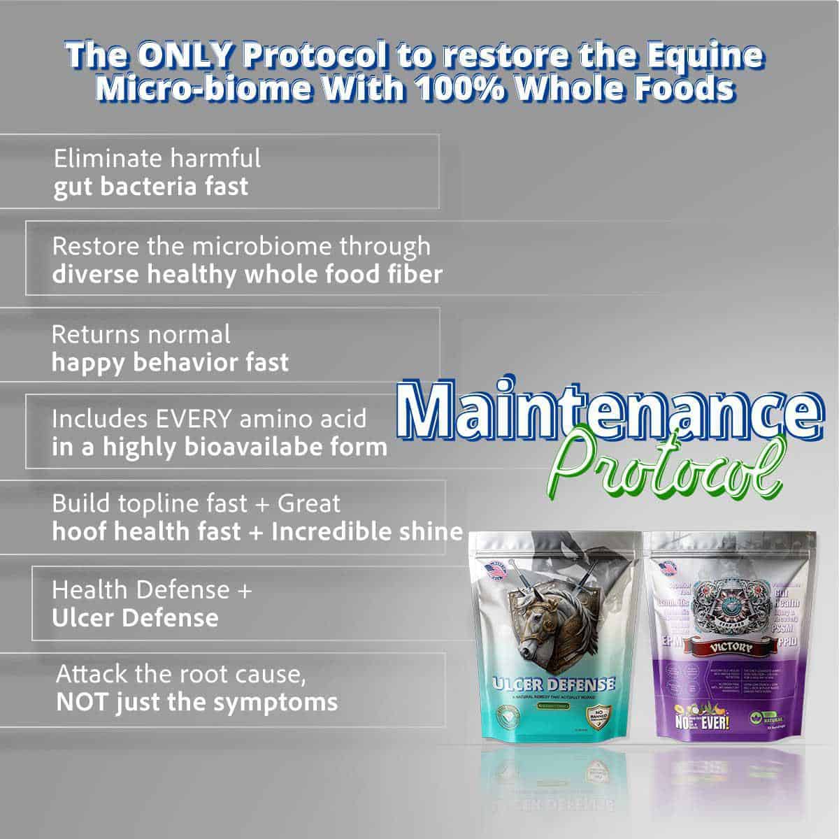 Maintenance Protocol combines ongoing gut protection (Ulcer Defense Maintenance) with complete whole food nutrition (Victory). It keeps your horse healthy long-term without the intensity of the Emergency Formula.