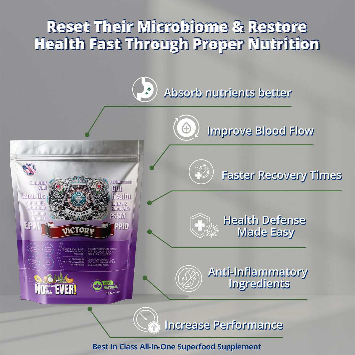 Your horse stays calm, comfortable, and focused. Gut health remains stable. Body condition stays optimal. No relapses. No setbacks. Just consistent wellness.